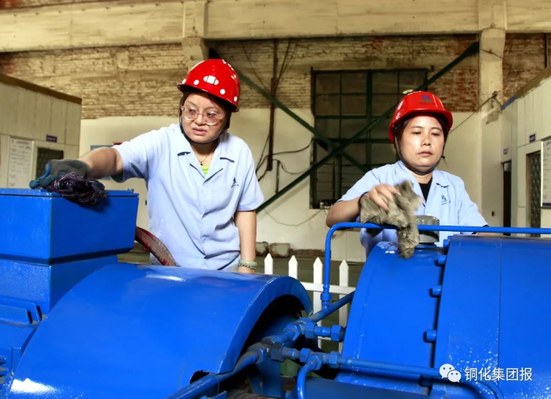 圖④:在運(yùn)輸工區(qū)西翼副井卷?yè)P(yáng)班,女工們正在清潔提升設(shè)備,保障清潔文明生產(chǎn)。