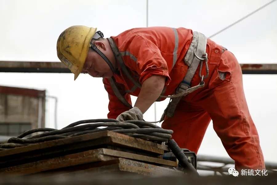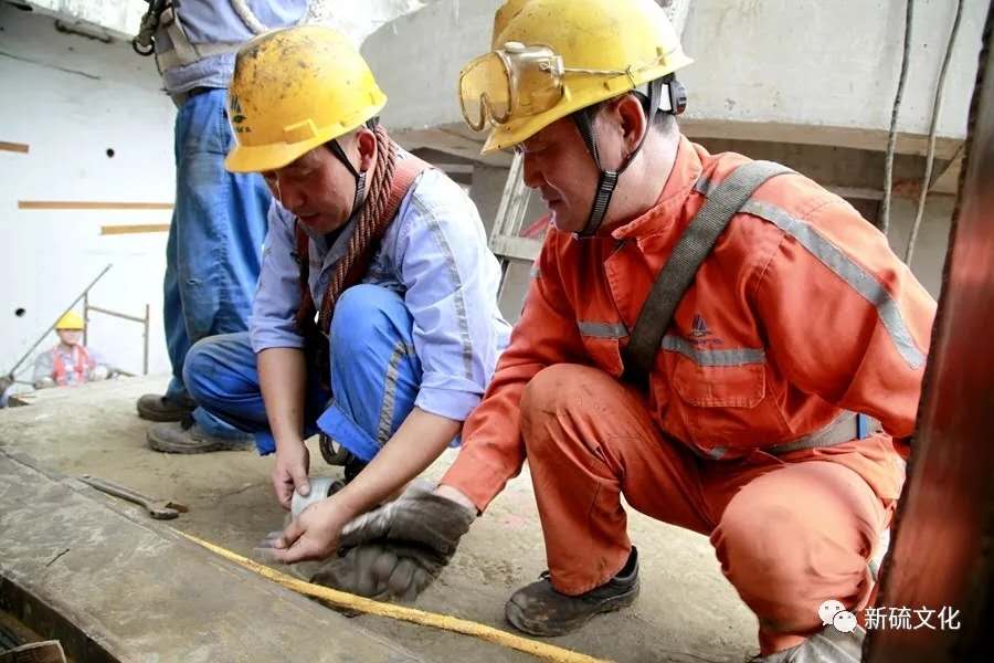 地面上大吊車、大貨車,選礦廠相關負責人、技術人員、安全員等忙著起吊龐然大物時,“焊高組”在底座上也一刻沒閑著,拖運電焊設備、準備焊接材料、在底座上鋪水泥保持平面,各個槽體支腳找平衡......由于底座緊挨著磨浮車間,空氣不流通,加上天氣悶熱難擋,武裝整齊的好“焊”們一會就汗濕了工作服,汗珠順著安全帽壓著的發根往下滾。
